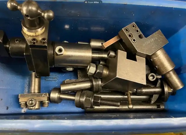 Includes 8 ft long material feed stand, built in cutting lubricant pump, a wide variety of collets (see photos), 2 external threading heads with various inserts. and assorted parting/ cut-off and chanfer tool holders.